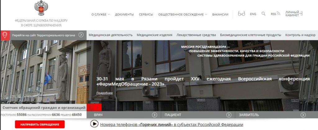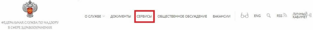 1.访问Roszdravnadzor官网 https://roszdravnadzor.gov.ru/ ,进入“服务(Сервисы)”栏目。